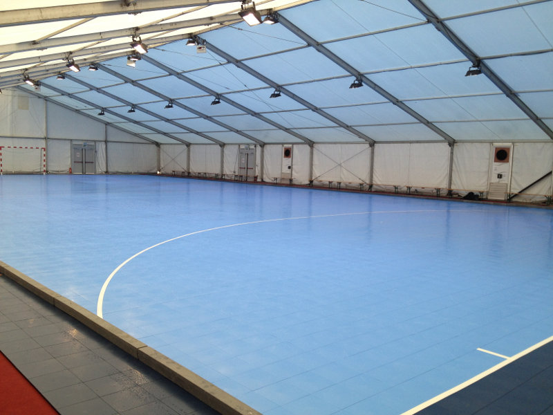In tijdelijke sportcentra als blaashallen etc.